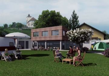 die unmittelbare nähe des campingplatzes zu unserem büro beflügelt die begeisterung zu einem vorschlag (vision), welche wir dem vorstand des einwohnervereins unterbreiten durften. die bestehende anlage entspricht nicht mehr den heutigen anforderungen. unser vorschlag: abbruch und neubau! ergänzend zu den allgemeinen räumen haben wir mehrbettzimmer im og vorgeschlagen. im weiteren wurde ein allfälliger neubau des musikheims mitberücksichtigt. eine direkte verbindung und die mitbenützung der räumlichkeiten